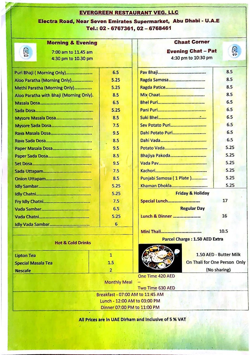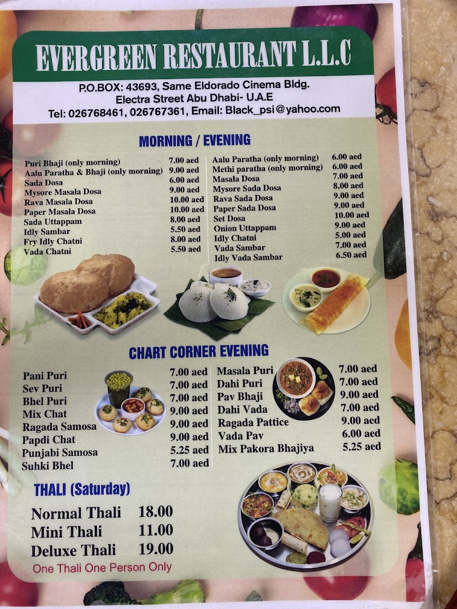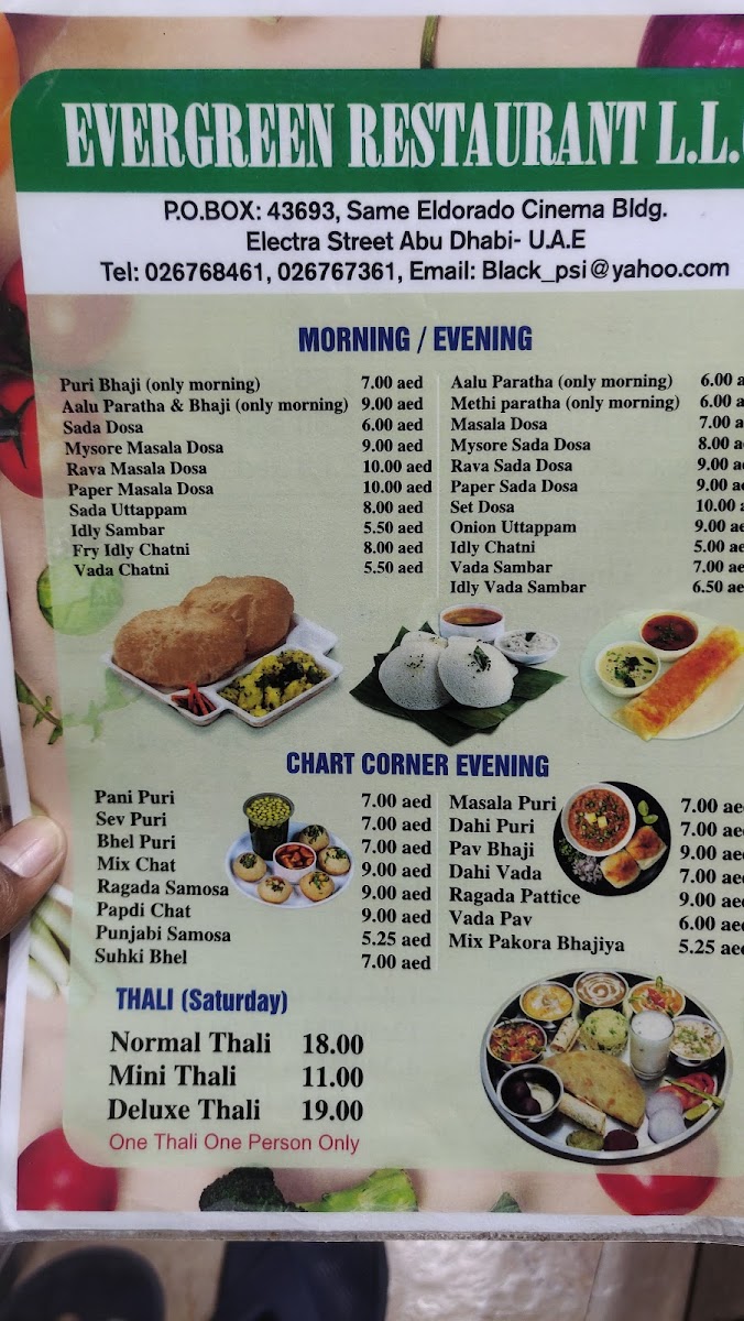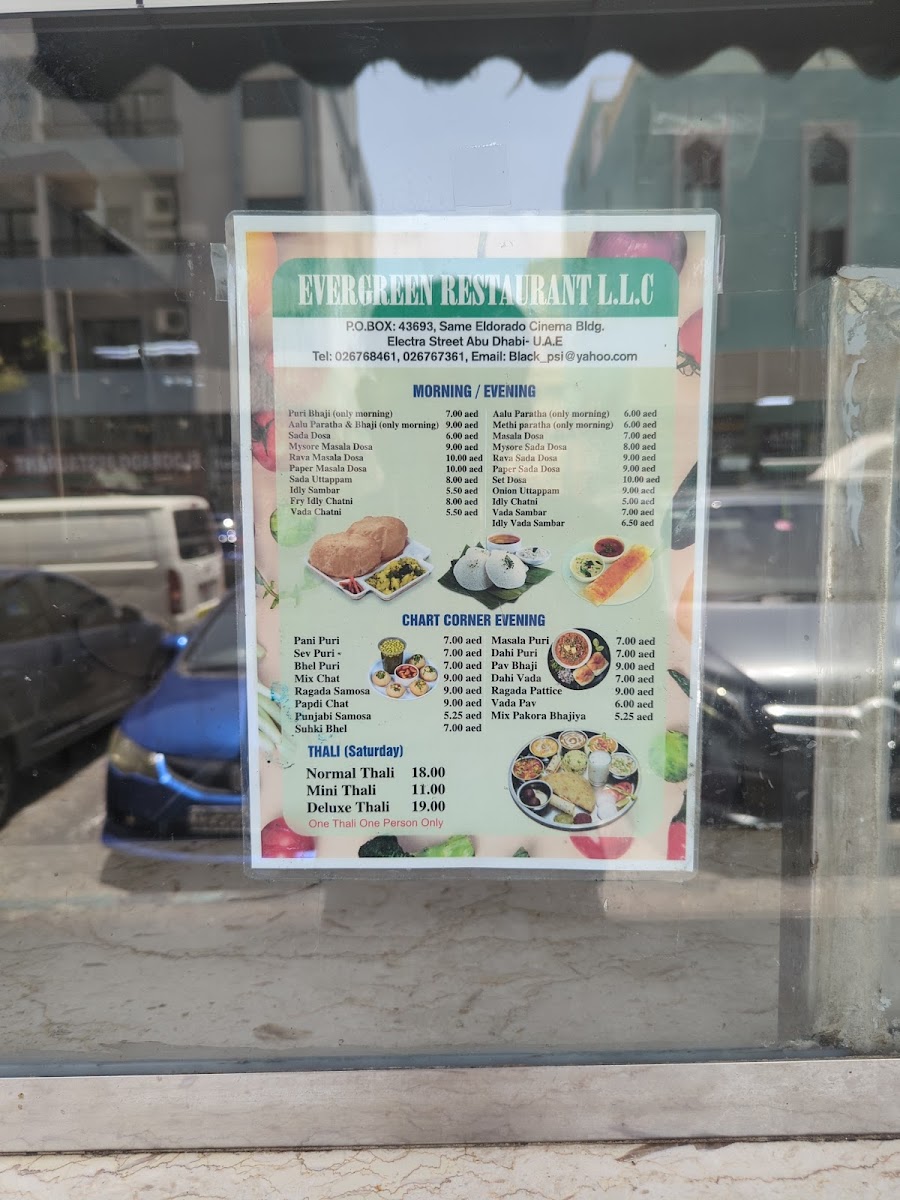 Evergreen Restaurant (Electra Branch) is a cozy, no-frills eatery hidden in the heart of Abu Dhabi’s Electra area, specializing in authentic Indian vegetarian cuisine. The menu offers a delightful spectrum—from crisp, light dosas and flavorful onion ottappams to wholesome vegetarian thalis crafted with minimal oil and just the right spices. Each dish bursts with familiar, comforting flavors that speak of home-cooked simplicity. Noteworthy are the vibrant chaats—mix chaat and samosa chaat—which deliver satisfying, tangy bites at budget-friendly prices. The pav bhaji and gulab jamun add a sweet and spicy balance that keeps you coming back for more.
