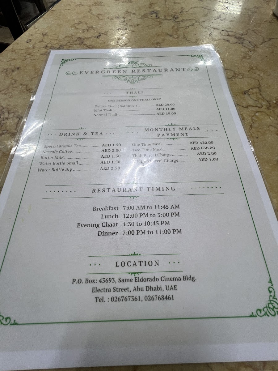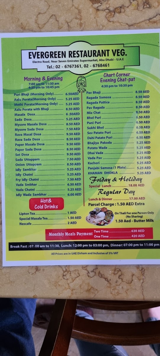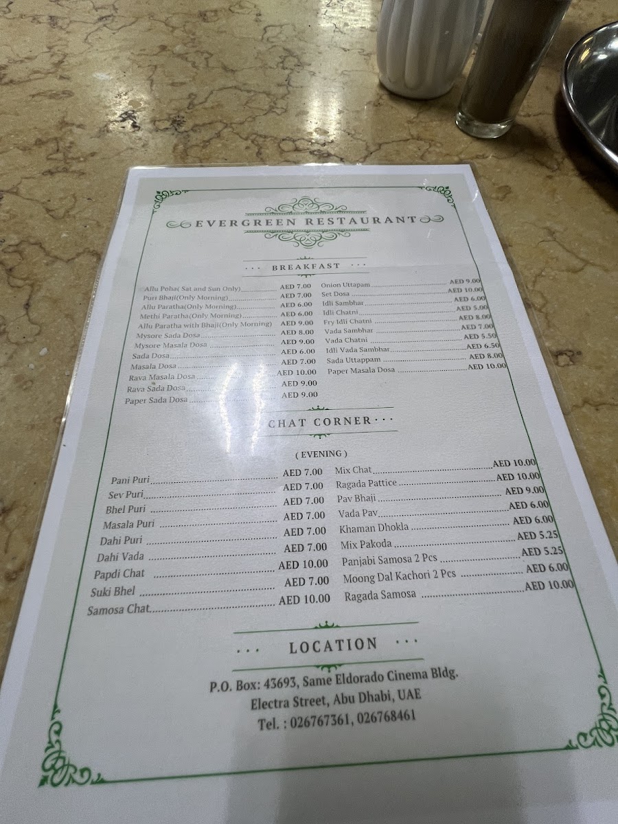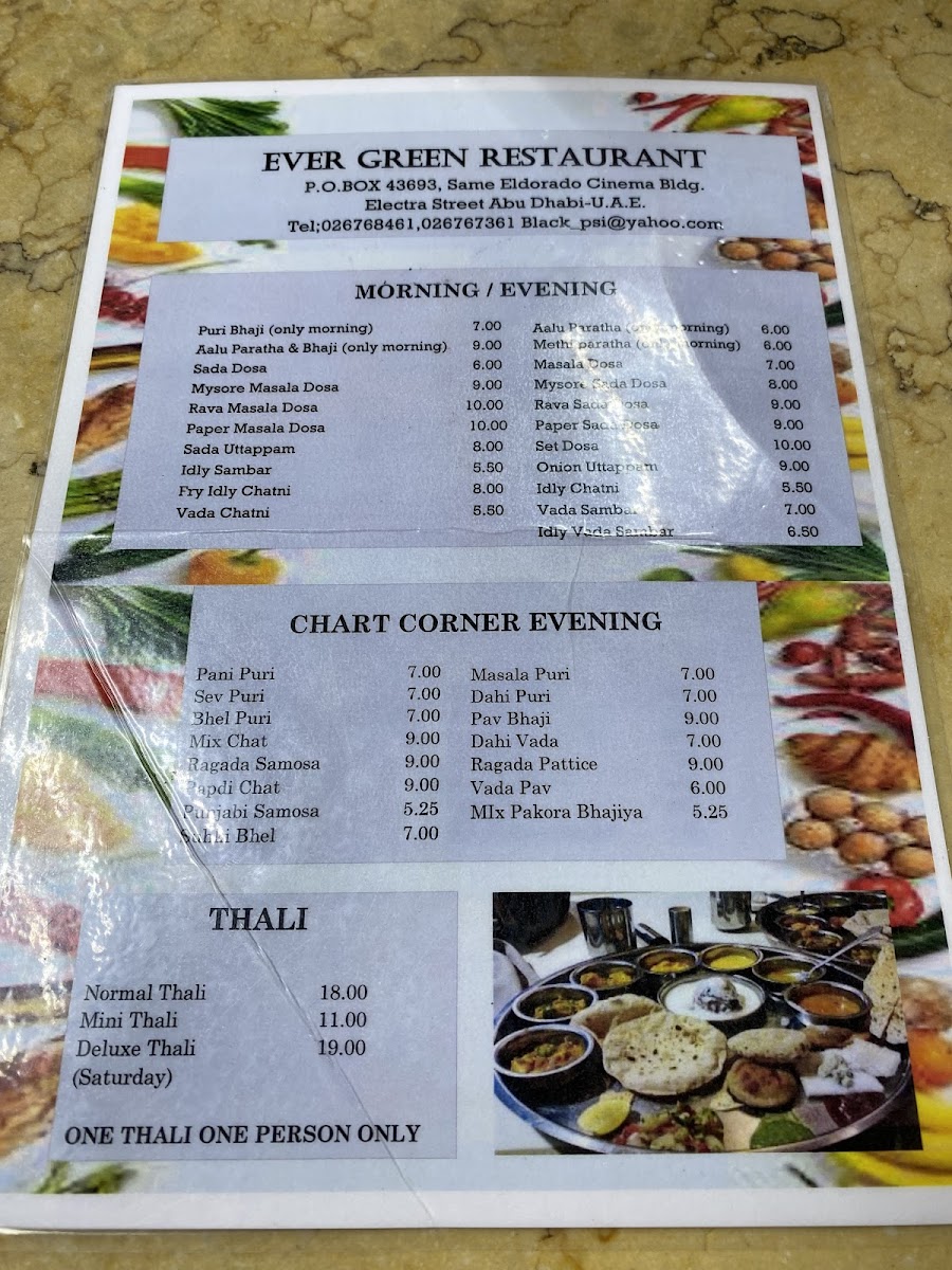 Evergreen Restaurant (Electra Branch) is a cozy, no-frills eatery hidden in the heart of Abu Dhabi’s Electra area, specializing in authentic Indian vegetarian cuisine. The menu offers a delightful spectrum—from crisp, light dosas and flavorful onion ottappams to wholesome vegetarian thalis crafted with minimal oil and just the right spices. Each dish bursts with familiar, comforting flavors that speak of home-cooked simplicity. Noteworthy are the vibrant chaats—mix chaat and samosa chaat—which deliver satisfying, tangy bites at budget-friendly prices. The pav bhaji and gulab jamun add a sweet and spicy balance that keeps you coming back for more.